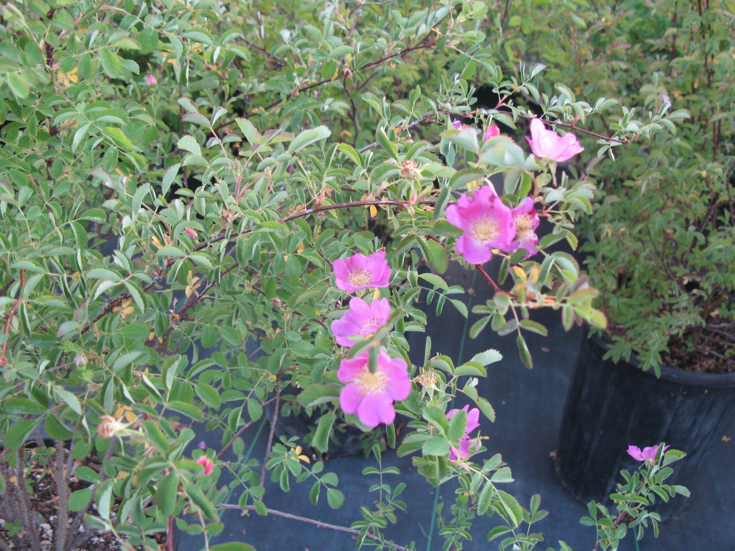 Multi-branched deciduous shrub with red stems, prickly on the lower portion. Orange-red rosehips remain throughout winter, providing food source for birds. Prefers moist soil but may be found in drier, open areas. Rhizomatous growth; excellent for stream stabilization or erosion control.