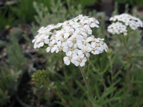 Perennial herb with feathery, lance-shaped leaves that are evenly distributed along stem. Flowers clustered, forming flat white top.